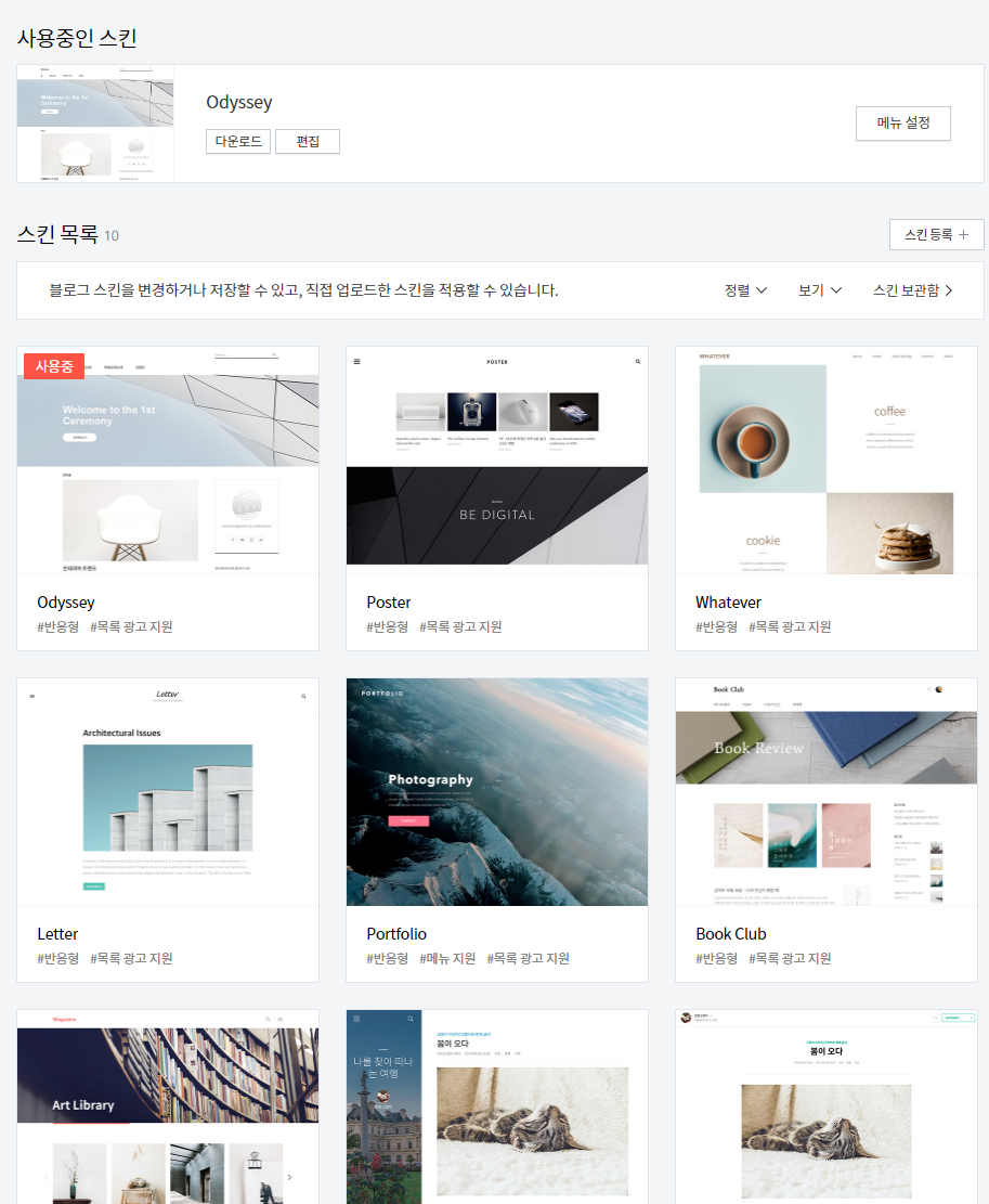 다음은 스킨입니다. 스킨은 티스토리에서 기본으로 제공하는 여러 가지와 그 외에 유무료로 배포하는 스킨을 사용할 수 있습니다. 일단 저는 쌈박하게 그냥 기본 스킨 중 Odyssey를 사용했습니다. 스킨은 원하는 디자인을 선택하면 좋을 것 같습니다. 다만, 기본 스킨 중에서는 목록 광고 지원 태그가 없는 것들도 있는데, 이 경우에는 아마도 추후 광고 게시에 어려움이 있을 수 있으니 주의하시기 바랍니다.