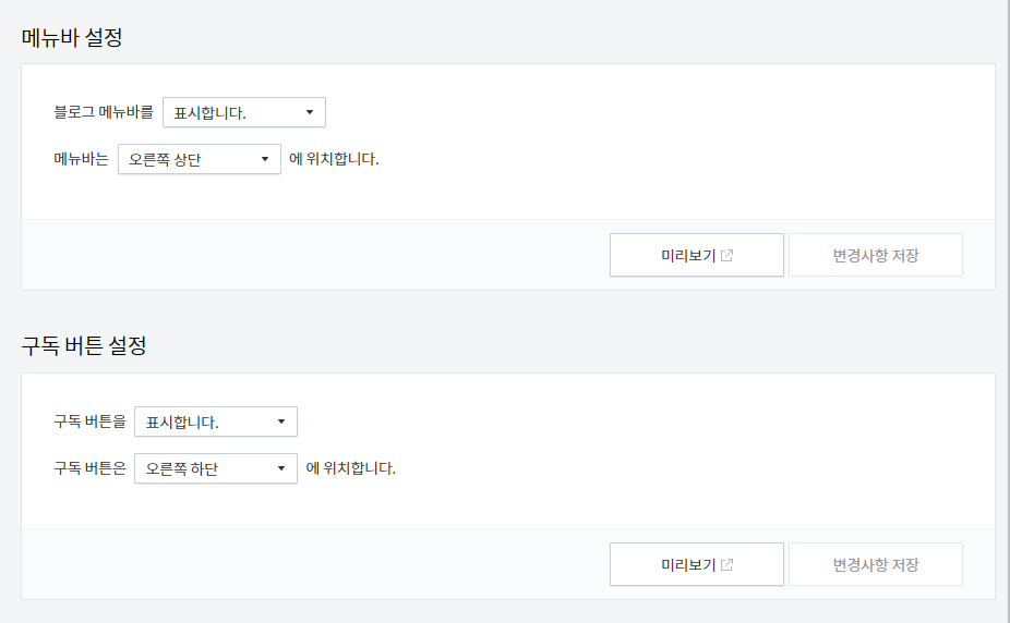 다음은 메뉴바 설정인데요, 메뉴바는 오른쪽 상단에, 구독 버튼은 오른쪽 하단에 출력되도록 해두었습니다.