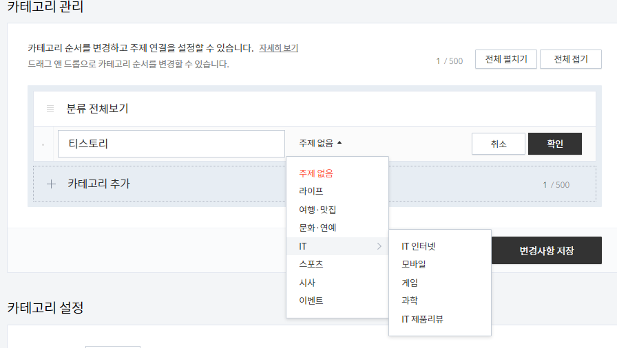 먼저 글을 쓰기 위해서 카테고리를 만들어보겠습니다. 저는 티스토리를 주제로 글을 쓸 예정이므로 ‘티스토리’라는 제목으로 카테고리를 만들었고, 분류는 IT 인터넷을 설정했습니다. 완료됐다면 확인 후 변경사항 저장을 통해 카테고리를 추가할 수 있습니다.