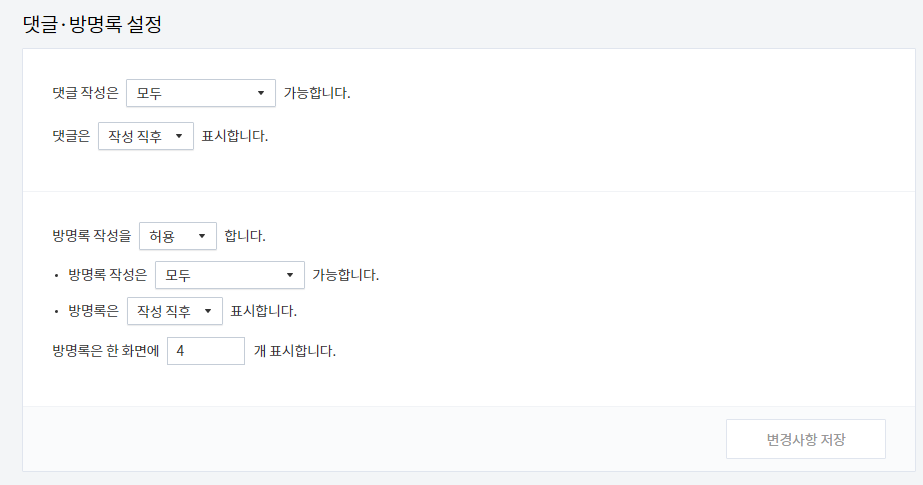 다음은 댓글과 방명록입니다. 저 같은 경우, 이쪽은 특별히 건드릴 만한 내용이 없어서 따로 설정하지 않았습니다. 댓글이나 방명록이 불편하시다면 비허용하거나 로그인한 사용자만 허용하도록 할 수 있습니다.