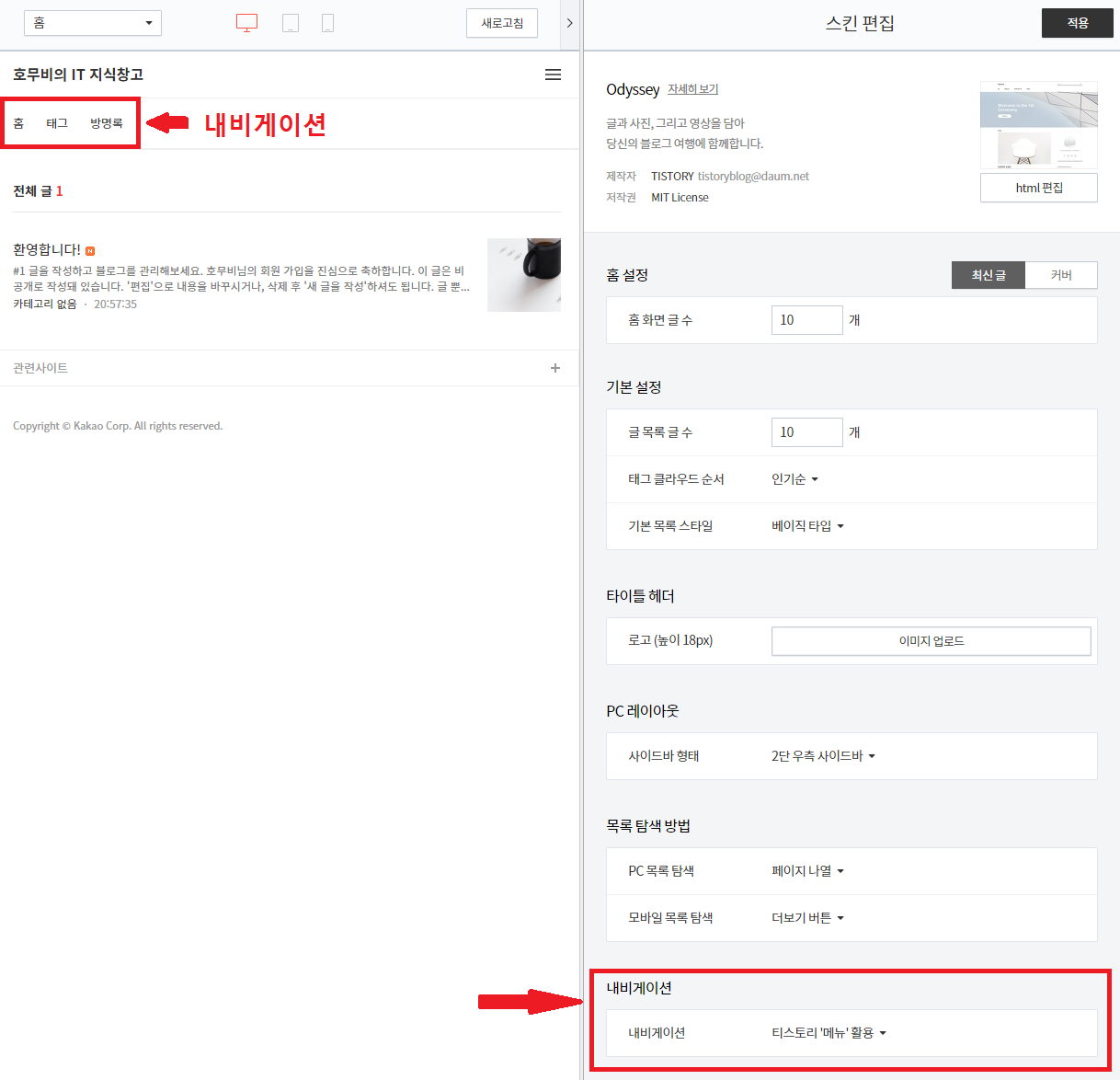 이렇게 설정한 스킨은 일부 설정을 변경할 수 있습니다. 여러 가지 세팅할 수 있는 설정들이 많지만, 아직 저는 글이 없어 큰 차이를 확인하기 어렵습니다. 일단은 내비게이션만 사용하도록 하겠습니다.