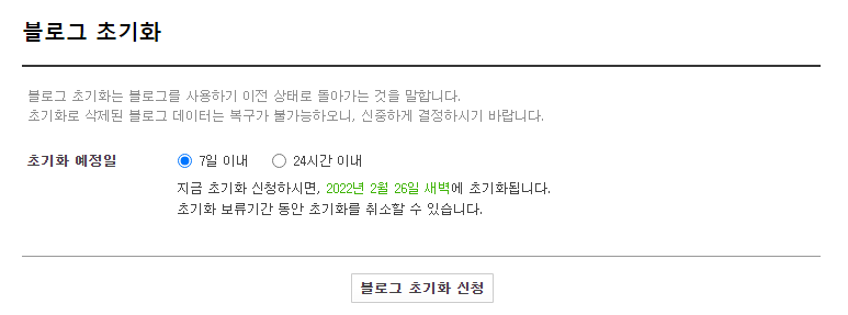 이를 해결하기 위해서는 여러 가지 방법이 있지만, 일단 가장 간단한 것은 블로그를 초기화하는 것입니다. 네이버 블로그에서는 블로그 초기화 기능을 지원합니다. (블로그 삭제는 불가능합니다.)