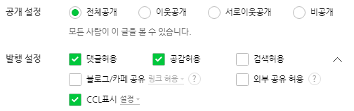 해당 글은 다음과 같이 공개 설정은 전체공개이지만 검색허용, 외부 공유 허용, 블로그/카페 공유 모두 비활성화해놓았습니다.