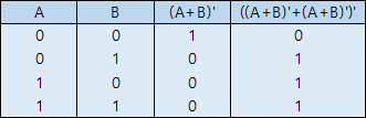 앞선 NAND와 마찬가지 쉽게 생각하면 NOT 게이트를 2번 통과한 것과 같습니다. NOR(=OR+NOT) + NOT 이므로 결과는 역시 OR 게이트가 됩니다.