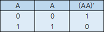 NOT 게이트 구현이 가장 쉽기 때문에, 첫 번째로 살펴보겠습니다. NAND의 입력값을 병렬로 연결하여 하나로 통일해 주었습니다. 그 결과인 (AA)' 의 진리표를 보면 (AA)'=A' 임을 알 수 있습니다. AA=A 이므로 굳이 NAND 진리표와 비교해보지 않아도 쉽게 결과를 알 수 있습니다. 따라서, 첫 번째 조건이었던 NOT 게이트를 구현하는 데 성공했습니다.