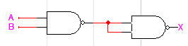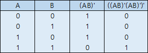 회로를 보면 NAND 게이트 2개를 사용하여 AND 게이트를 구현한 것을 확인할 수 있습니다. 이해가 어렵다면 진리표를 살펴봅시다. 먼저 첫 번째 NAND 게이트를 통해 (AB)' 라는 결과값을 얻을 수 있고, 진리표를 통해 A, B의 각 진리값에 대한 결과를 확인할 수 있습니다. 그 결과값이 다음 입력에 병렬로 들어가므로 이는 앞서 본 NOT과 같습니다. ((AB)'(AB)')'=((AB)')'=AB 이므로 NAND를 통해 AND 게이트를 구현하였습니다.