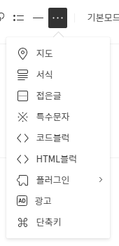 티스토리 에디터는 그 외에도 여러 가지 기능을 제공합니다. 지도나 특수문자, 코드 블럭 등의 추가가 가능합니다. 지금부터는 그중에서 코드 관련 기능에 대해 집중적으로 살펴보겠습니다.