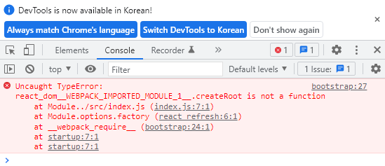 createRoot is not a fuction이라며 콘솔에서 문제를 보고하고 있는데요, 해당 내용을 또 수정해주어야 합니다.