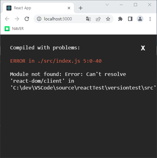 앞선 오류 메시지를 다시 한번 잘 살펴보도록 하겠습니다. 해당 내용은 콘솔뿐만 아니라 localhost:3000에서도 확인이 가능합니다.