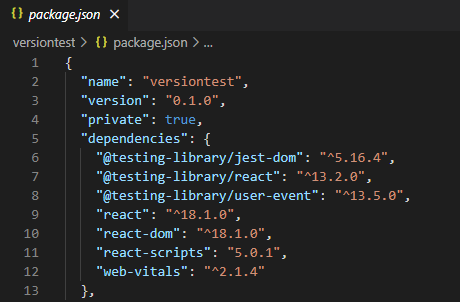 그런데 상황에 따라 더 낮은 버전의 리액트를 사용해야 할 수 있습니다. 저의 경우 package.json을 보면 react와 react-dom 버전이 18.1.0인 것을 확인할 수 있습니다.
