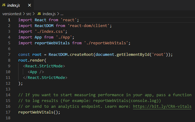 기존 코드는 다음과 같이 ReactDOM의 createRoot 함수를 통해 root 객체를 만들어주고, 해당 객체를 render하는 방식으로 되어 있었습니다. 하지만 이건 리액트 18.0 버전에서 사용하는 방식이고, 하위 버전에서는 동작하지 않습니다.