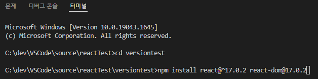 버전 변경은 아주 간단하게 명령어 하나로 해결 가능합니다. 아래와 같이 npm install react@^[버전 정보] react-dom@[버전 정보] 명령을 통해 변경할 수 있습니다. 저 같은 경우는 17.0.2로 낮추고 싶어서 해당 버전으로 진행했습니다.