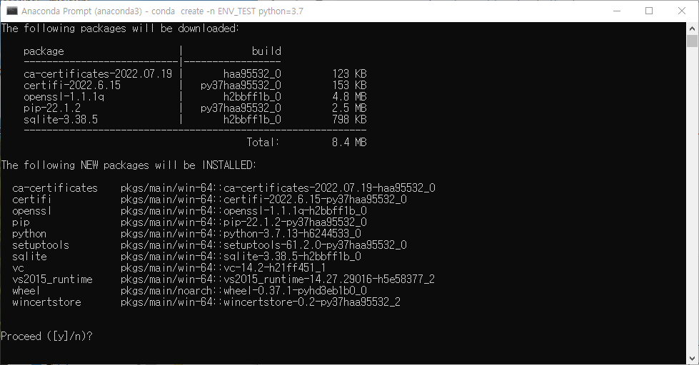 먼저 가상환경을 생성하는 방법입니다. 위와 같이 가상환경 이름을 명시해주고 실행합니다. 예를 들어 가상환경이름은 ENV_TEST로 하고 파이썬 버전은 3.7을 설치한다고 하면 아래와 같이 명령어를 입력해주면 됩니다.