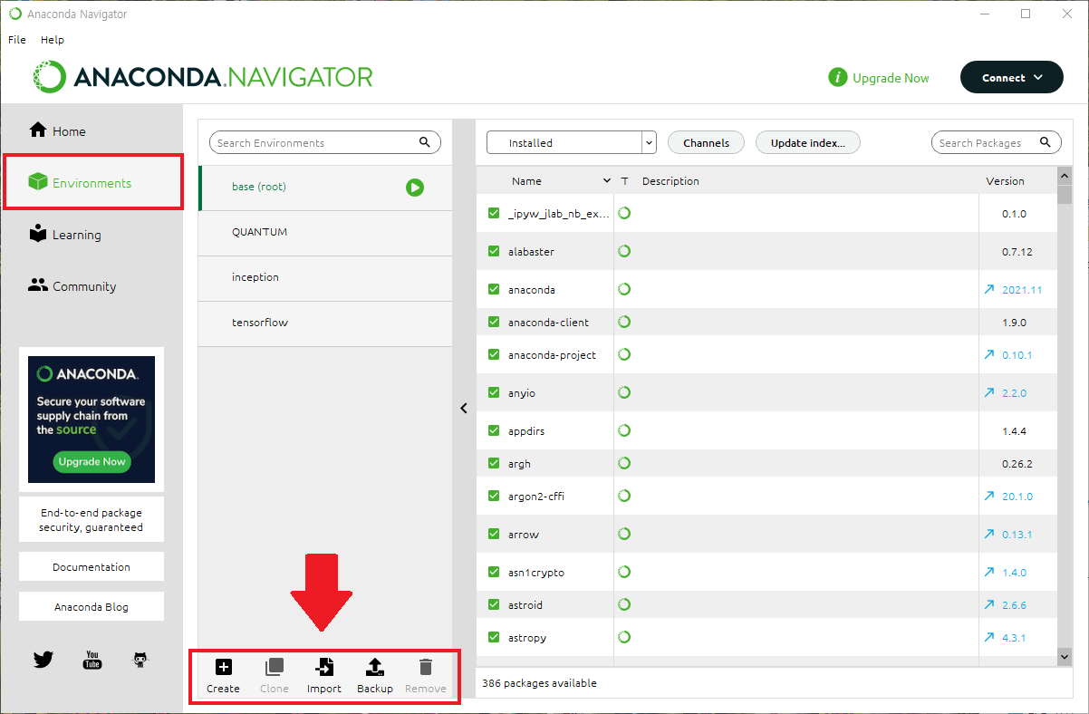 아나콘다 내비게이션을 사용할 경우, Environments 탭 하단에 제공되는 기능을 통해 작업이 가능합니다.