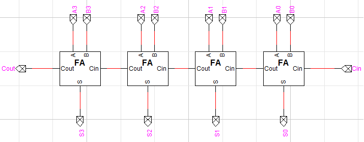 n-bit 가산기는 단순하게 n개의 전가산기를 연결하여 만들 수 있습니다. 이전 비트의 Cout이 다음 비트의 Cin이 되도록 연결하면 됩니다. 4bit 가산기를 한번 만들어보았는데요, 완성된 회로는 다음과 같습니다.
