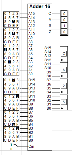 이렇게 상태 변수까지 추가하여 가산기를 완성했습니다! 연산 결과도 잘 출력되는 것을 확인할 수 있습니다. 참고로 Zero의 경우 input이 16개인 NOR 게이트가 따로 없어서 4bit마다 NOR 연산 후 그 결과들을 AND 게이트로 연결하여 체크하였습니다.