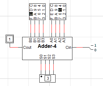 오른쪽 사진을 보면 연산을 잘 수행하는 것을 확인할 수 있습니다. 입력 A는 5(0101), B는 E(1110)이므로 S는 3(0011), Cout은 1이 나오는 것입니다.