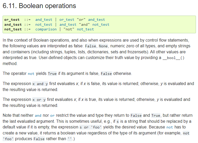 파이썬에서의 논리곱/논리합 연산은 다음과 같은 원리에 따라 이루어집니다. 공식 문서를 확인해봅시다.