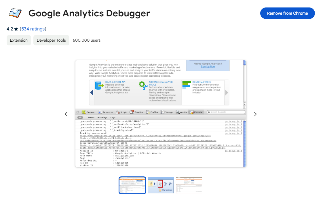 어떤 문제인지 짐작조차 가지 않아서 고민을 많이 했는데, 크롬 웹스토어에서 Google Analyitcs Debugger 라는 확장 프로그램을 찾을 수 있었습니다. 구글 애널리틱스 디버그 버전 정보를 출력해 준다고 합니다. 이제 이 프로그램을 이용하여 직접 오류 메시지를 확인해 볼 수 있습니다.