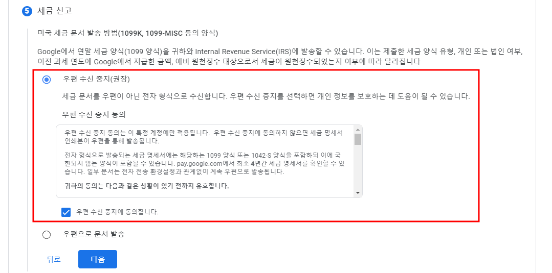 세금 신고 항목은 세금 문서를 어떤 형태로 받을지에 관한 것인데, 굳이 불편하게 우편으로 받을 이유가 없으므로 '우편 수신 중지'로 선택하시면 됩니다. 대신 이메일로 받을 수 있습니다.