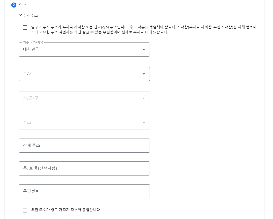 두 번째는 주소입니다. '영주권 주소 아래에 있는 우체국 사서함 또는 전교(c/o) 주소입니다' 항목은 체크하지 않으셔도 되고, 나머지 내용만 영문으로 입력해 주시면 됩니다. 그리고 가장 아래의 '우편 주소가 영구 거주지 주소와 동일합니다'는 체크해주세요.