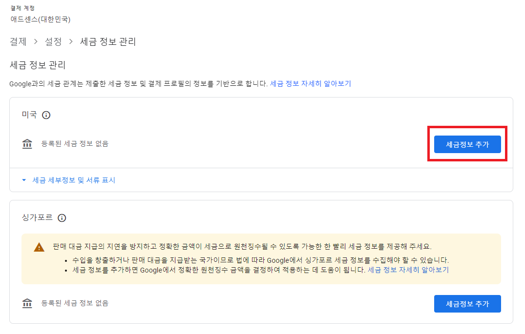 아마 클릭하시면 아래와 같은 페이지가 나오실 텐데, 미국 칸에 있는 세금 정보 추가 버튼을 클릭하시면 됩니다.