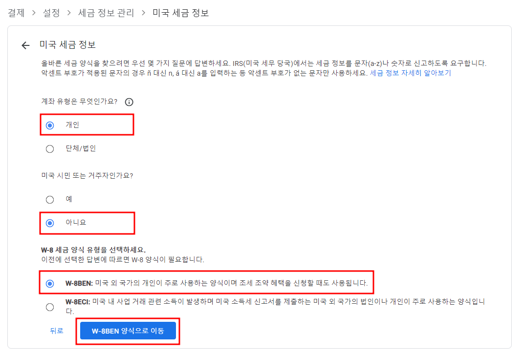 저는 W-8BEN 양식을 선택했기 때문에, 해당 정보를 입력하는 페이지로 넘어왔습니다.