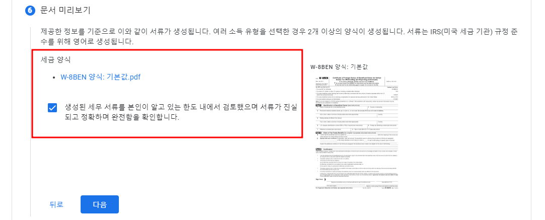 여기까지 작성했다면 W-8BEN 양식이 모두 마무리되었습니다. 문서 미리보기에서 지금까지 작성한 내용을 pdf로 다운받을 수 있습니다. 다운로드하여 보관해 두시길 바랍니다.